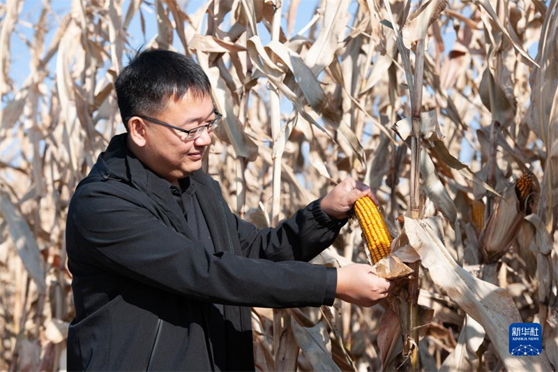 10月16日,黑龍江省寶清縣農(nóng)業(yè)農(nóng)村局副局長張強在農(nóng)田中查看玉米成熟情況。新華社發(fā)(鄂麗霞 攝)
