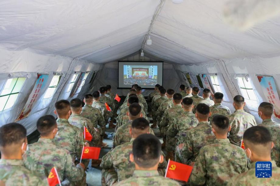 10月16日,東部戰(zhàn)區(qū)陸軍第71集團軍某旅王杰生前所在部隊組織官兵在野外駐訓場收看中國共產(chǎn)黨第二十次全國代表大會開幕會。新華社發(fā)(劉重陽 攝)