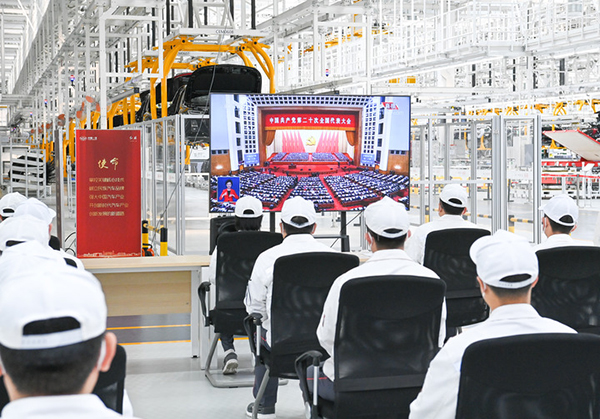 10月16日,在吉林省長(zhǎng)春市中國(guó)第一汽車集團(tuán)有限公司紅旗繁榮工廠,職工在收看中國(guó)共產(chǎn)黨第二十次全國(guó)代表大會(huì)開(kāi)幕會(huì)。新華社記者 顏麟蘊(yùn) 攝