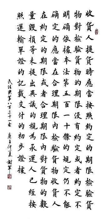 民法典第八百三十一條 收貨人提貨時(shí)應(yīng)當(dāng)按照約定的期限檢驗(yàn)貨物。對(duì)檢驗(yàn)貨物的期限沒(méi)有約定或者約定不明確,依據(jù)本法第五百一十條的規(guī)定仍不能確定的,應(yīng)當(dāng)在合理期限內(nèi)檢驗(yàn)貨物。收貨人在約定的期限或者合理期限內(nèi)對(duì)貨物的數(shù)量、毀損等未提出異議的,視為承運(yùn)人已經(jīng)按照運(yùn)輸單證的記載交付的初步證據(jù)。