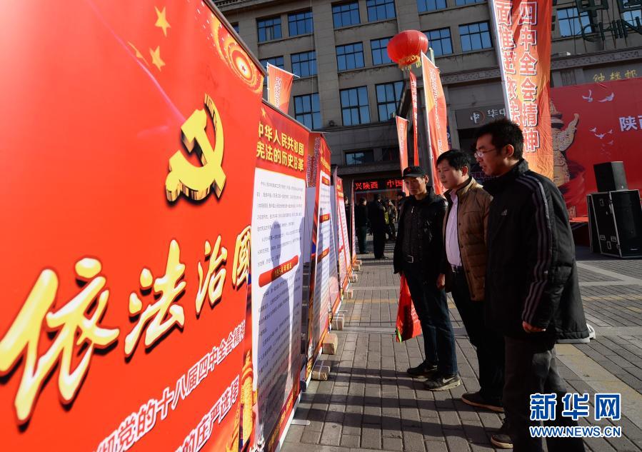 西安市民在國家憲法日宣傳活動(dòng)現(xiàn)場觀看依法治國宣傳展板(2014年12月4日攝)。新華社記者 李一博 攝