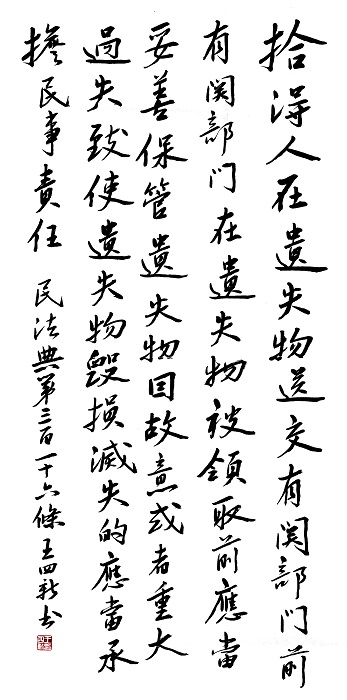民法典第三百一十六條 拾得人在遺失物送交有關(guān)部門前,有關(guān)部門在遺失物被領(lǐng)取前,應(yīng)當(dāng)妥善保管遺失物。因故意或者重大過失致使遺失物毀損、滅失的,應(yīng)當(dāng)承擔(dān)民事責(zé)任。
