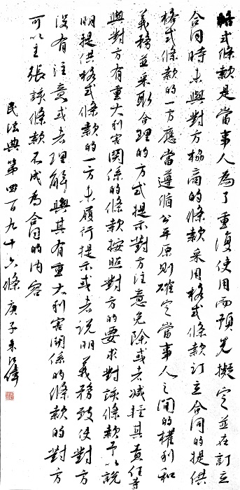 民法典第四百九十六條 格式條款是當事人為了重復(fù)使用而預(yù)先擬定,并在訂立合同時未與對方協(xié)商的條款。