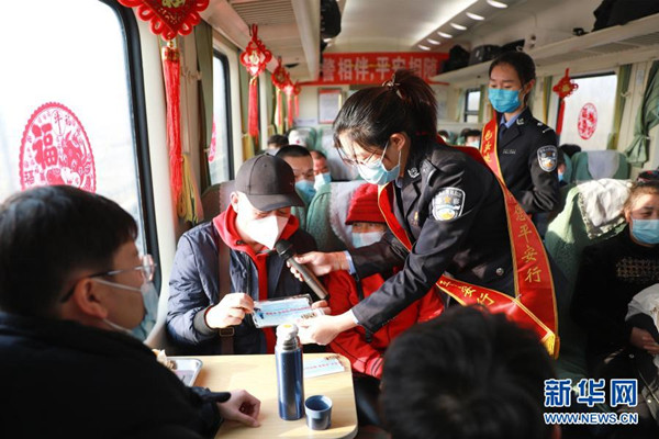 春運(yùn)臨近,包頭鐵路公安處組織開(kāi)展“鐵警相伴 平安相隨”主題宣傳活動(dòng)。1月25日,在由包頭開(kāi)往南寧的Z338次列車(chē)上,包頭鐵路公安處民警以豐富多彩的文藝演出為載體,進(jìn)行春運(yùn)出行防疫知識(shí)宣傳?! ⌒氯A社發(fā)