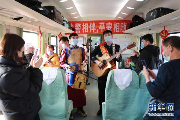 1月25日,包頭鐵路公安處民警(右)在列車(chē)上與旅客共同表演文藝節(jié)目?!?/span>