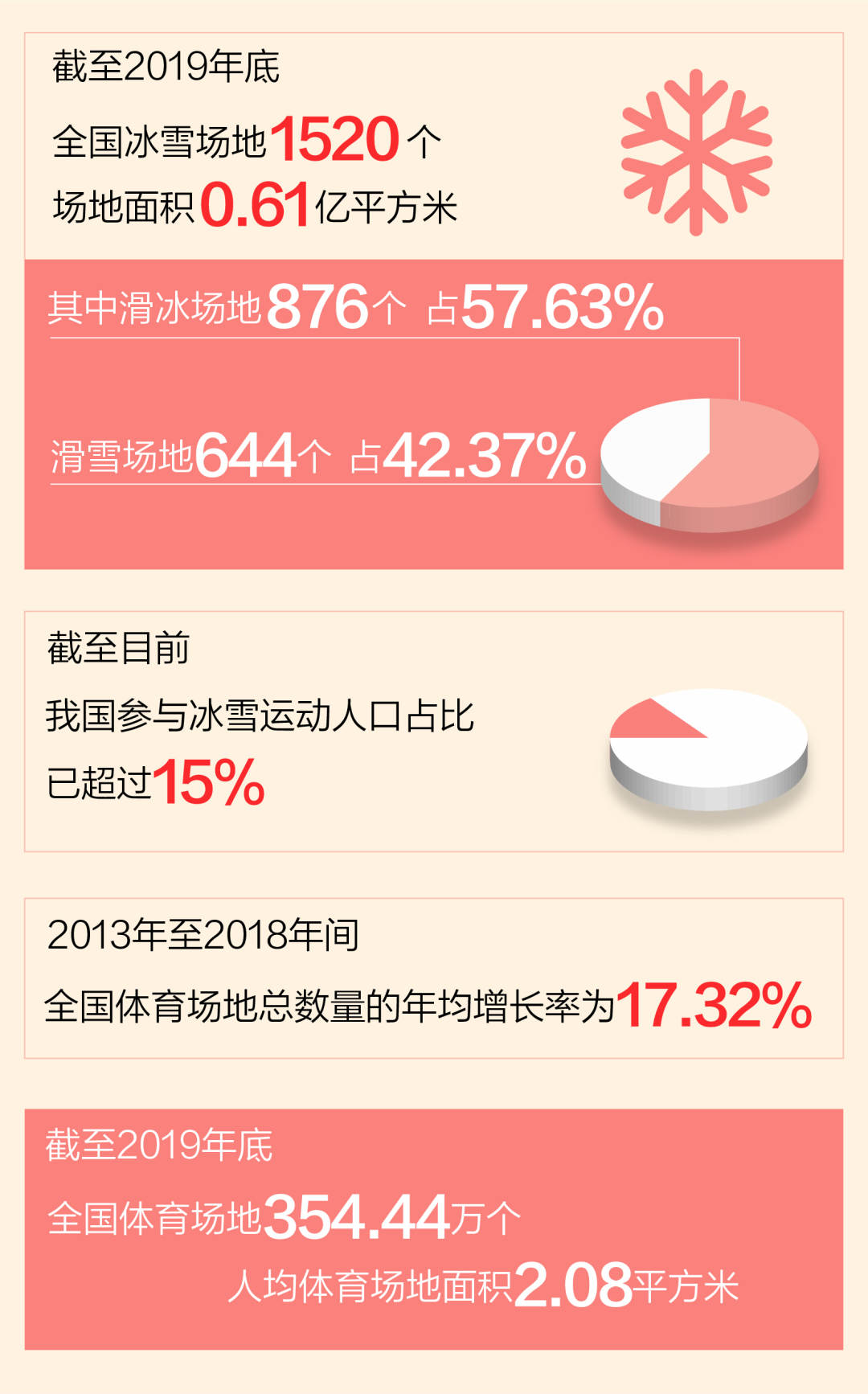 “全國大眾冰雪季”“中國冰雪大會”……從北方到各地,從冬季到四季,群眾性冰雪活動正開展得如火如荼,為全民健身增添了更加多元多彩的內(nèi)容。2013年至2018年間,包括冰雪運(yùn)動在內(nèi)的全國體育場地總數(shù)量年均增長率為17.32%,努力滿足著人民群眾不斷增長的運(yùn)動健身需要;各級各類群眾性體育賽事活動不斷豐富,每年參與總?cè)藬?shù)超過1億人次,城鄉(xiāng)居民參加過群眾性體育賽事或展示活動的比例分別達(dá)到56.18%和59.36%。神州大地生機(jī)勃勃,全民健身蔚為風(fēng)尚,成為全體人民增強(qiáng)體魄、健康生活的基礎(chǔ)和保障。