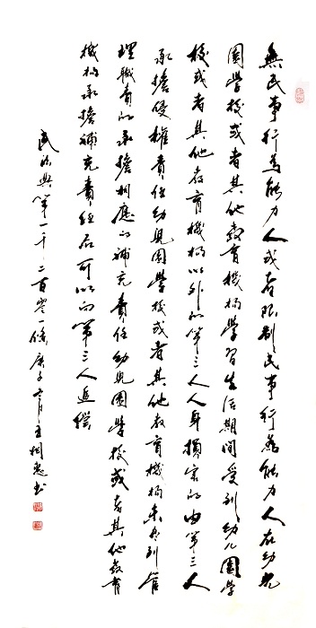 民法典第一千二百零一條 無民事行為能力人或者限制民事行為能力人在幼兒園、學校或者其他教育機構學習、生活期間,受到幼兒園、學?;蛘咂渌逃龣C構以外的第三人人身損害的,由第三人承擔侵權責任;幼兒園、學?;蛘咂渌逃龣C構未盡到管理職責的,承擔相應的補充責任。幼兒園、學?;蛘咂渌逃龣C構承擔補充責任后,可以向第三人追償。