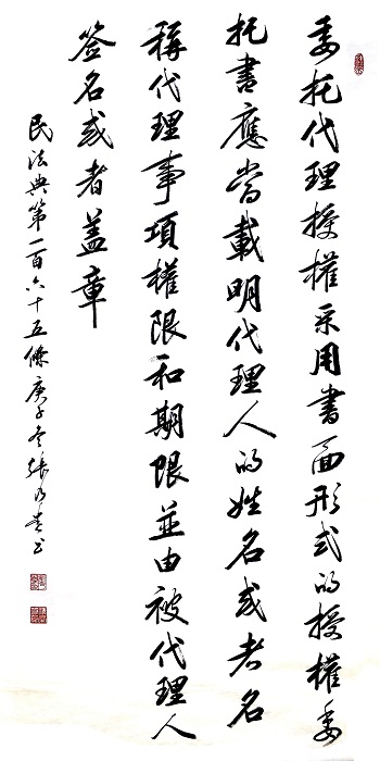 民法典第一百六十五條 委托代理授權(quán)采用書面形式的,授權(quán)委托書應(yīng)當(dāng)載明代理人的姓名或者名稱、代理事項(xiàng)、權(quán)限和期限,并由被代理人簽名或者蓋章。