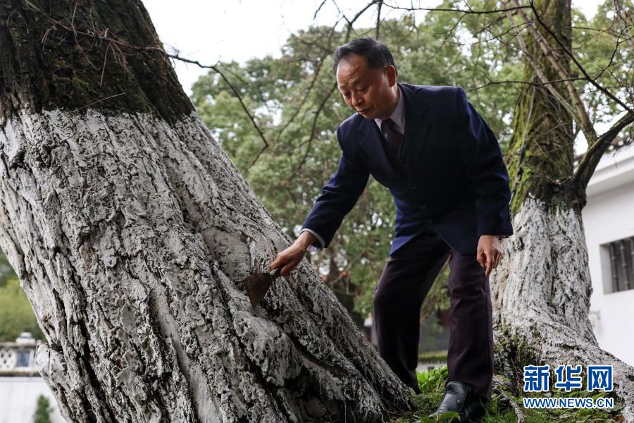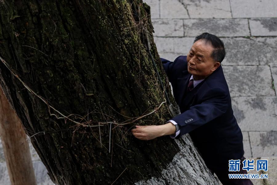 1月27日,67歲的“樹醫(yī)生”張本光在查看遵義會議會址前槐樹的生長狀況。新華社記者 歐東衢 攝