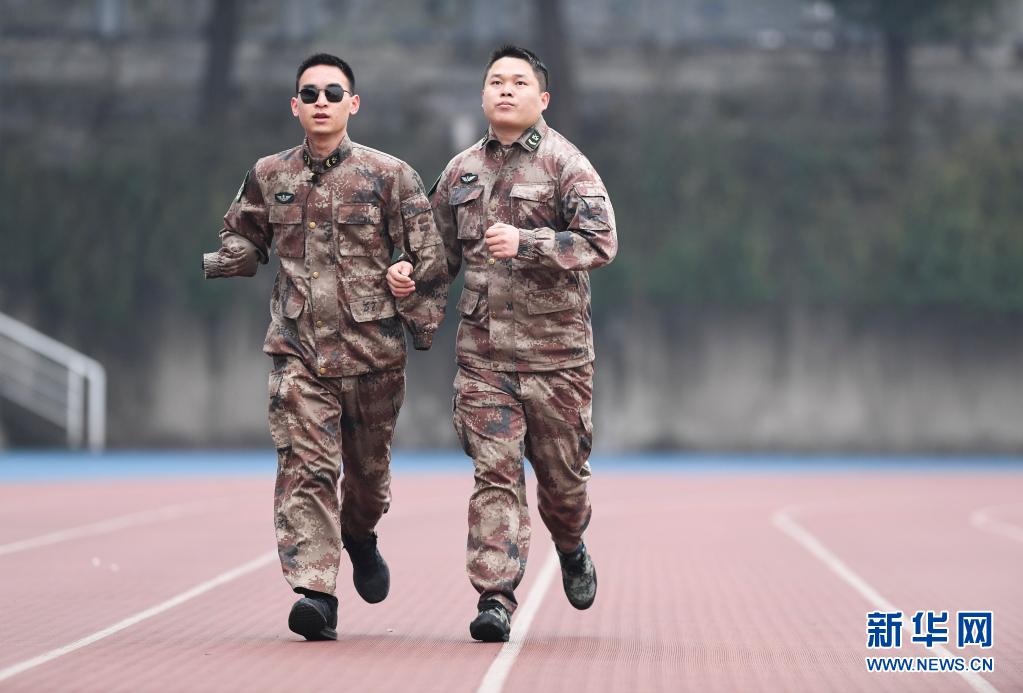 2020年1月2日,“排雷英雄戰(zhàn)士”杜富國(左)和戰(zhàn)友在陸軍軍醫(yī)大學(xué)操場上跑步。新華社記者 王全超 攝