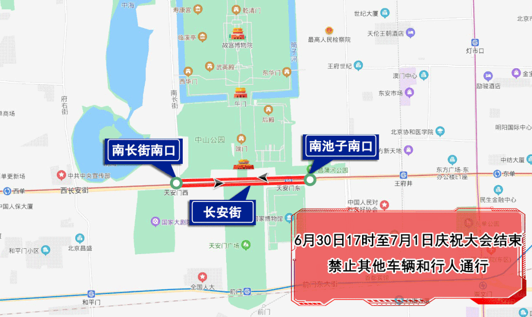 6月28日0時至7月1日慶祝大會結(jié)束,天安門前金水橋以北故宮午門以南地區(qū),西華門路口(不含)經(jīng)西華門大街、西筒子河路、東筒子河路、東華門大街至東華門路口(不含),除持有慶祝大會專用證件的車輛和人員外,禁止其他車輛和行人通行,機(jī)動車禁止停放。