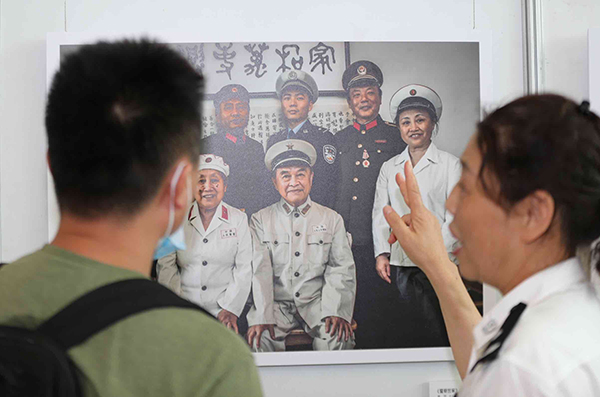 一位頭發(fā)花白的老人微微佝僂著身子,仔細(xì)觀看一幅名為《戰(zhàn)“疫”時期》的攝影作品。