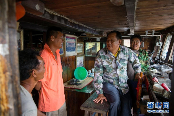 在海南省瓊海市潭門港的漁船上,王書(shū)茂(右二)與漁民交流(2018年11月14日攝)。新華社發(fā)(宋國(guó)強(qiáng) 攝)