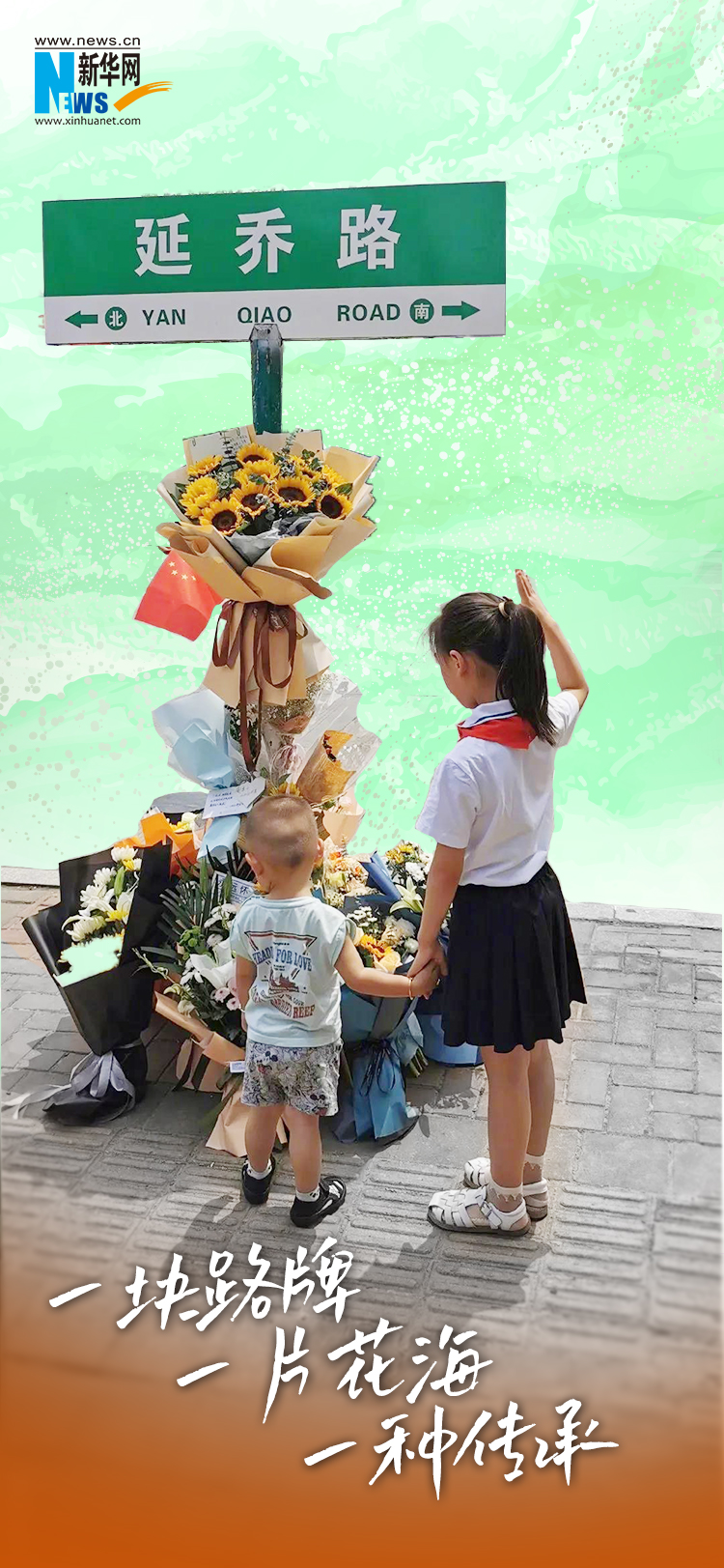 這幾天,這塊路牌成為鮮花環(huán)繞的“紀念碑”,人們自發(fā)在路牌下插上國旗,擺放鮮花、卡片。