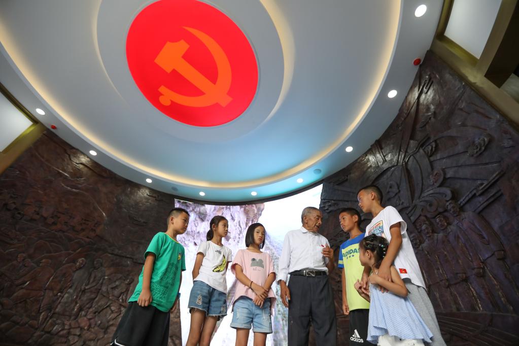 在“大發(fā)渠黨性教育陳列館”,黃大發(fā)向前來(lái)參觀的孩子們講述當(dāng)年的故事(2018年8月11日攝)。新華社記者劉續(xù)攝