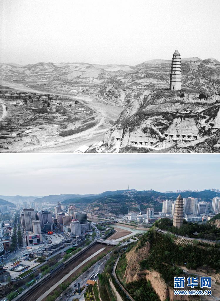 拼版照片:上圖是1938年拍攝的延安(資料照片),下圖是2021年4月22日拍攝的延安市(無人機(jī)照片,新華社記者張博文攝)。新華社發(fā)