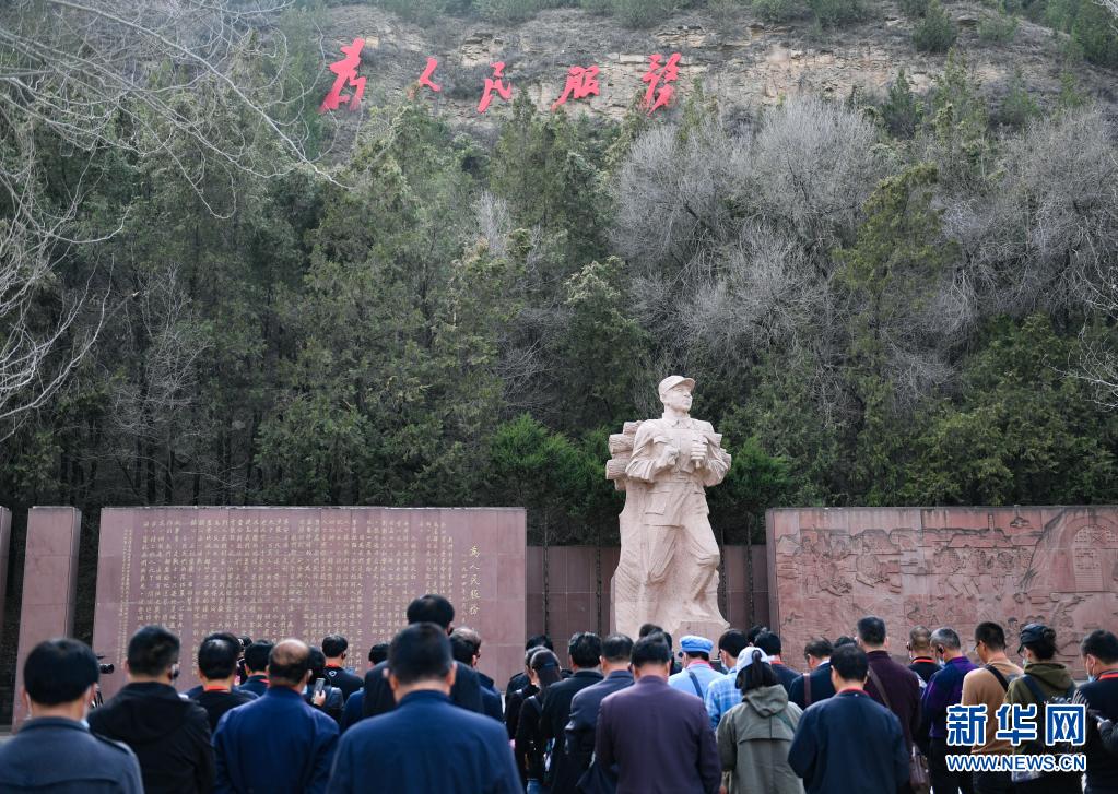 黨員干部在延安市張思德廣場進(jìn)行現(xiàn)場教學(xué)活動(dòng)(3月29日攝)。新華社記者 張博文 攝