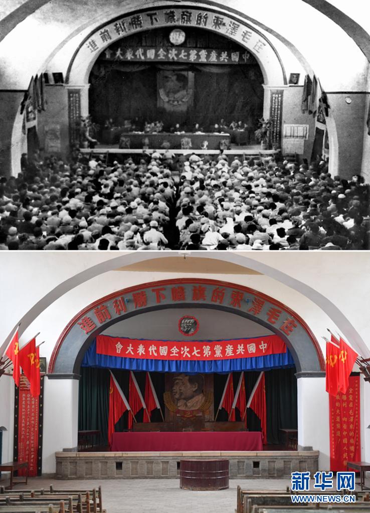 拼版照片:上圖是中共七大會(huì)場(資料照片),下圖是2021年3月31日拍攝的位于延安市楊家?guī)X革命舊址的中共七大會(huì)場(新華社記者 張博文 攝)。新華社發(fā)