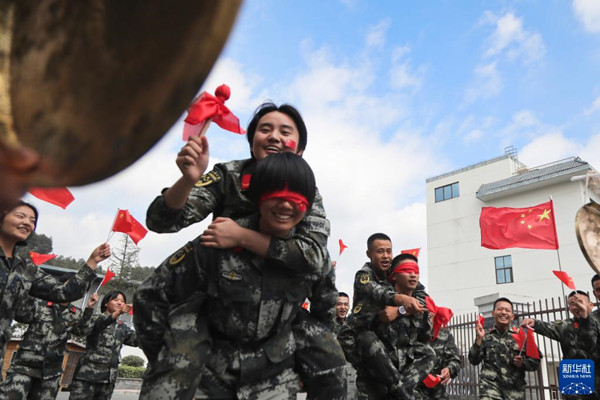 10月2日,武警重慶總隊(duì)執(zhí)勤第三支隊(duì)某中隊(duì)官兵參加“趣味保齡球”游戲。新華社發(fā)(彭勇 攝)