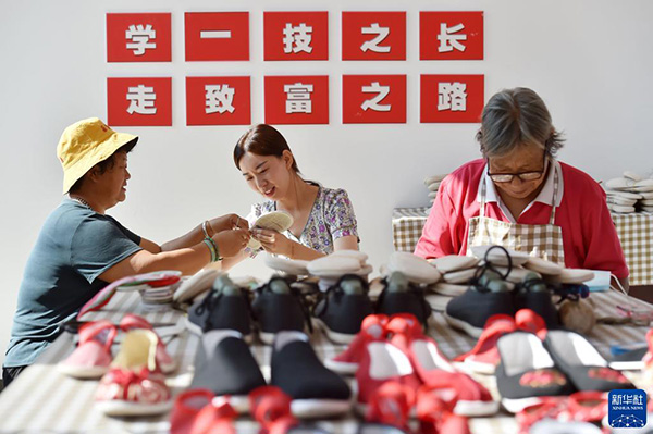 9月2日,在河北省平山縣北莊村的“團(tuán)結(jié)北莊手工坊”里,當(dāng)?shù)貗D女在縫制手工布鞋。 新華社發(fā)(張曉峰 攝)