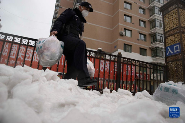 11月8日,在哈爾濱市平房區(qū)一處小區(qū),卡點(diǎn)執(zhí)勤民警幫助運(yùn)送生活物資。