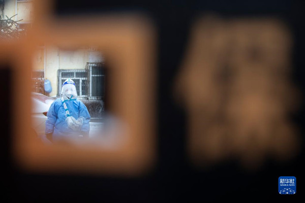11月8日,在哈爾濱市平房區(qū)一處卡點(diǎn),工作人員在執(zhí)勤。