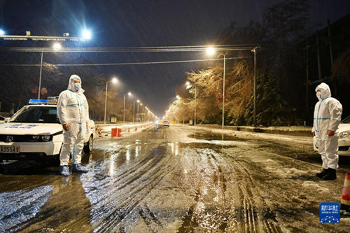 11月8日,在哈爾濱市平房區(qū)一進(jìn)出城卡點(diǎn),兩名公安人員在凍雨中執(zhí)勤。