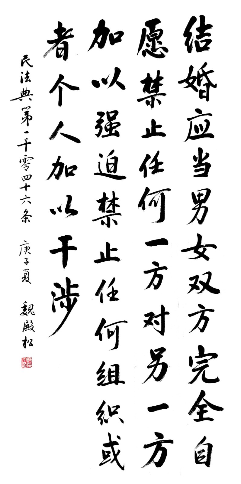 民法典第一千零四十六條 結(jié)婚應(yīng)當(dāng)男女雙方完全自愿,禁止任何一方對另一方加以強迫,禁止任何組織或者個人加以干涉。