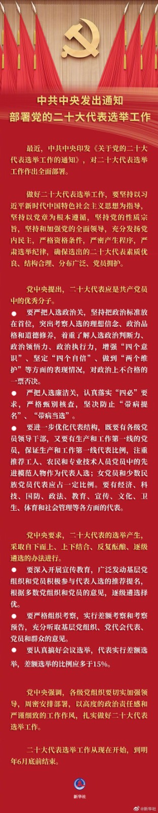 黨中央強調(diào),各級黨組織要切實加強領導,周密安排部署,以高度的政治責任感和嚴謹細致的工作作風,扎實做好二十大代表選舉工作。要嚴肅政治紀律、組織紀律和選舉紀律,充分運用湖南衡陽、四川南充、遼寧等地拉票賄選、破壞選舉案件,開展警示教育,汲取教訓,引以為戒。加強對代表選舉工作的全程監(jiān)督,對違規(guī)違紀違法問題“零容忍”,一經(jīng)發(fā)現(xiàn)堅決查處,確保風清氣正。要通過做好學習宣傳、組織動員、推薦提名、會議選舉、嚴肅紀律等各項工作,使代表選舉產(chǎn)生過程成為深入學習貫徹習近平新時代中國特色社會主義思想的過程,成為貫徹落實新時代黨的建設總要求和新時代黨的組織路線的過程,成為理想信念教育和黨性黨風黨紀黨史教育的過程,成為黨內(nèi)政治生活生動實踐和民主集中制教育的過程,進一步增強黨的創(chuàng)造力、凝聚力、戰(zhàn)斗力,動員廣大黨員、干部更加緊密地團結(jié)在以習近平同志為核心的黨中央周圍,不忘初心、牢記使命,攻堅克難、開拓奮進,為全面建設社會主義現(xiàn)代化國家、奪取新時代中國特色社會主義偉大勝利、實現(xiàn)中華民族偉大復興的中國夢作出新的更大貢獻。