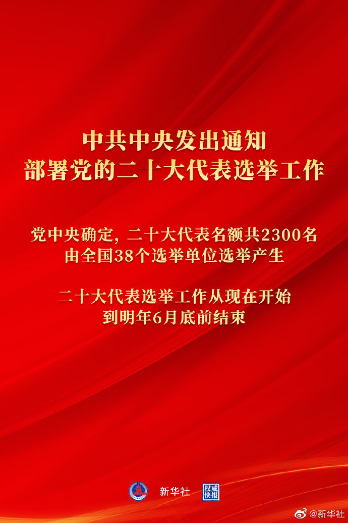 黨中央確定,二十大代表名額共2300名,由全國38個選舉單位選舉產(chǎn)生。做好二十大代表選舉工作,要堅持以習近平新時代中國特色社會主義思想為指導,堅持以黨章為根本遵循,堅持黨的性質(zhì)宗旨,堅持和加強黨的全面領導,充分發(fā)揚黨內(nèi)民主,嚴格資格條件,嚴密產(chǎn)生程序,嚴肅選舉紀律,確保選出的二十大代表素質(zhì)優(yōu)良、結(jié)構(gòu)合理、分布廣泛、黨員擁護。