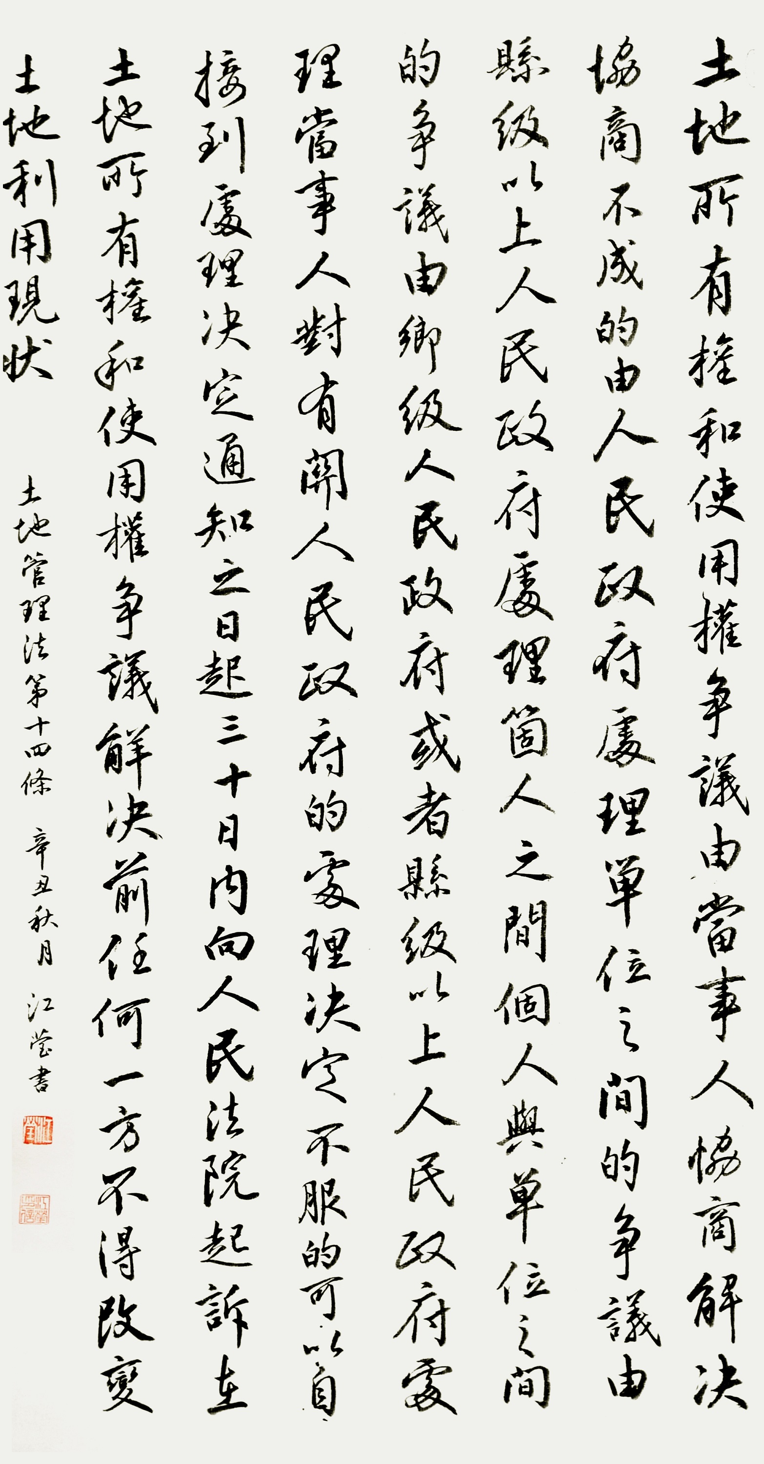 繼1600余位書法家參與書寫《中華人民共和國民法典》全部1260條法條之后,法治日報社聯(lián)合自然資源部法規(guī)司、自然資源部書畫研究會和北京昌平書法家協(xié)會,將筆端對準土地管理“一法一條例”,即《中華人民共和國土地管理法》和《中華人民共和國土地管理法實施條例》。