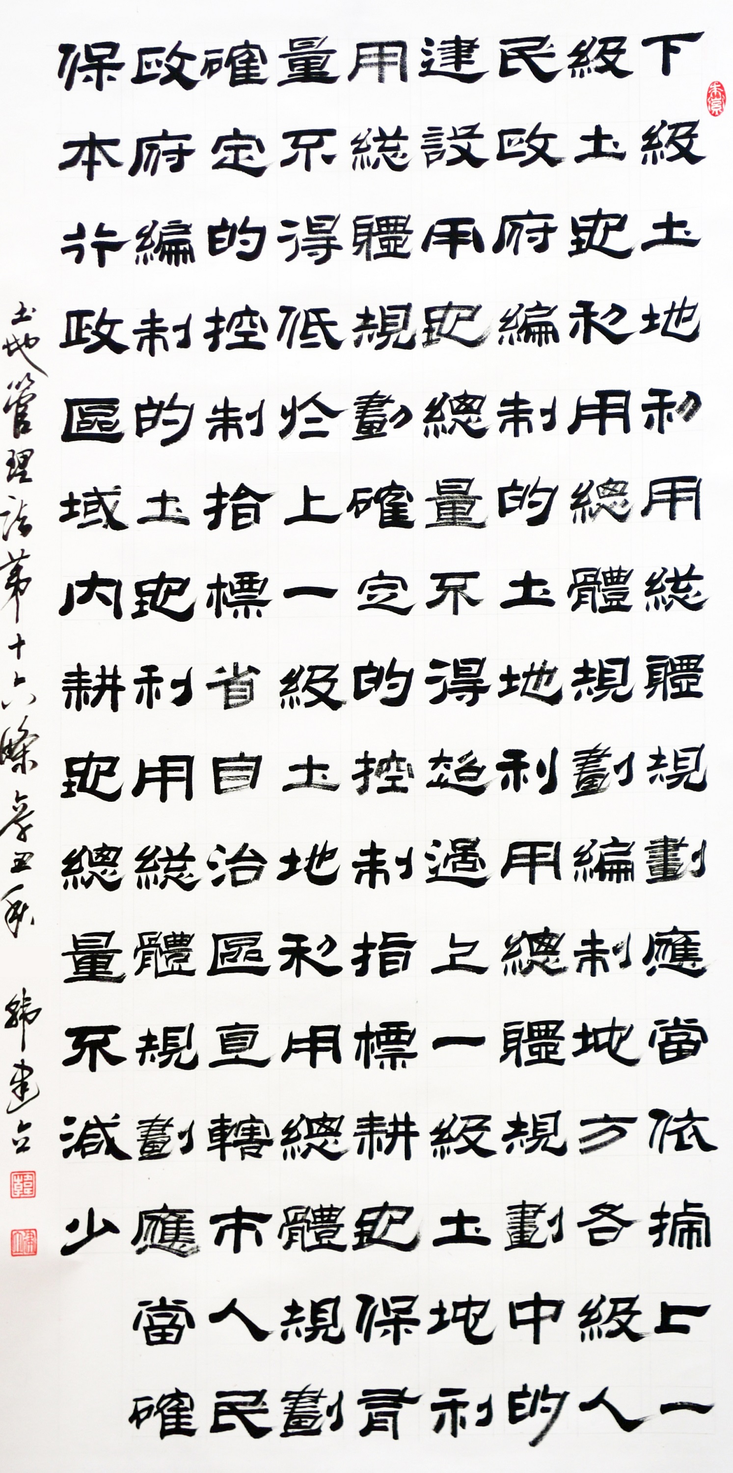 繼1600余位書法家參與書寫《中華人民共和國民法典》全部1260條法條之后,法治日?qǐng)?bào)社聯(lián)合自然資源部法規(guī)司、自然資源部書畫研究會(huì)和北京昌平書法家協(xié)會(huì),將筆端對(duì)準(zhǔn)土地管理“一法一條例”,即《中華人民共和國土地管理法》和《中華人民共和國土地管理法實(shí)施條例》。