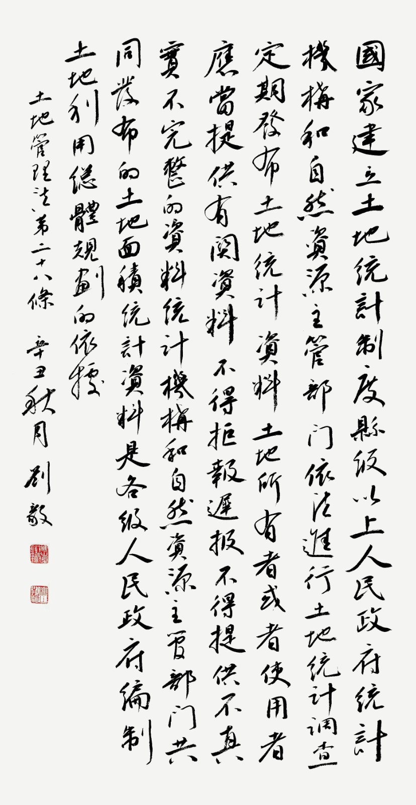 繼1600余位書法家參與書寫《中華人民共和國(guó)民法典》全部1260條法條之后,法治日?qǐng)?bào)社聯(lián)合自然資源部法規(guī)司、自然資源部書畫研究會(huì)和北京昌平書法家協(xié)會(huì),將筆端對(duì)準(zhǔn)土地管理“一法一條例”,即《中華人民共和國(guó)土地管理法》和《中華人民共和國(guó)土地管理法實(shí)施條例》。