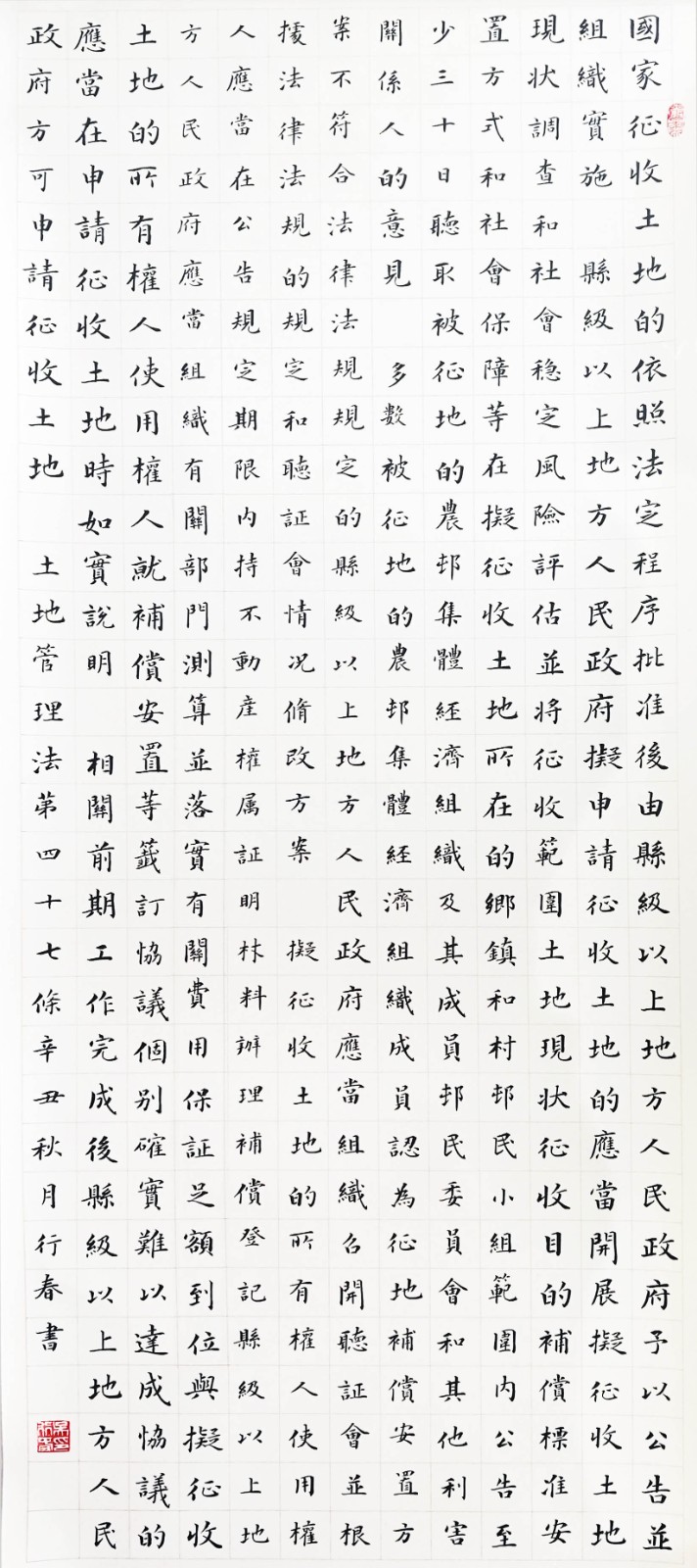 繼1600余位書法家參與書寫《中華人民共和國(guó)民法典》全部1260條法條之后,法治日?qǐng)?bào)社聯(lián)合自然資源部法規(guī)司、自然資源部書畫研究會(huì)和北京昌平書法家協(xié)會(huì),將筆端對(duì)準(zhǔn)土地管理“一法一條例”,即《中華人民共和國(guó)土地管理法》和《中華人民共和國(guó)土地管理法實(shí)施條例》。