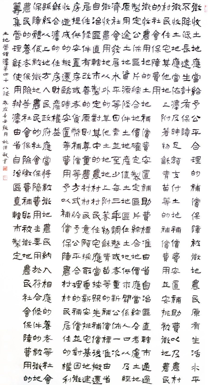 繼1600余位書法家參與書寫《中華人民共和國民法典》全部1260條法條之后,法治日報社聯(lián)合自然資源部法規(guī)司、自然資源部書畫研究會和北京昌平書法家協(xié)會,將筆端對準土地管理“一法一條例”,即《中華人民共和國土地管理法》和《中華人民共和國土地管理法實施條例》。