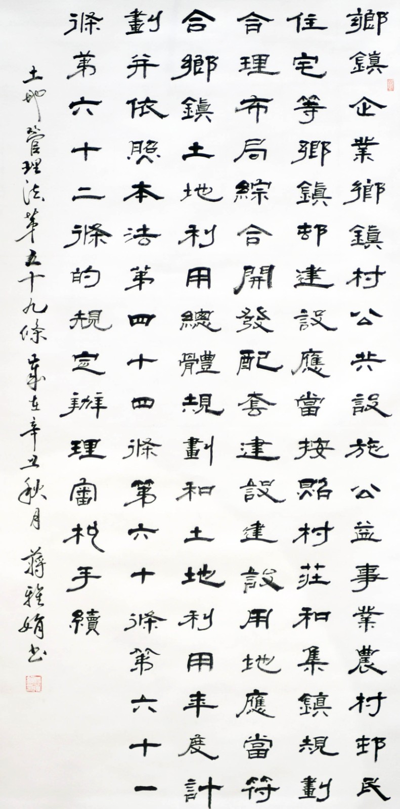 繼1600余位書法家參與書寫《中華人民共和國民法典》全部1260條法條之后,法治日報(bào)社聯(lián)合自然資源部法規(guī)司、自然資源部書畫研究會(huì)和北京昌平書法家協(xié)會(huì),將筆端對準(zhǔn)土地管理“一法一條例”,即《中華人民共和國土地管理法》和《中華人民共和國土地管理法實(shí)施條例》。