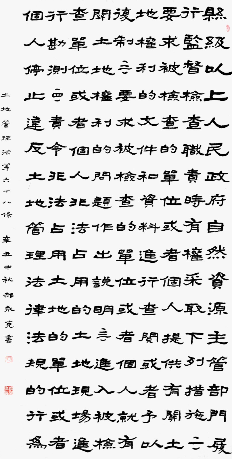 繼1600余位書法家參與書寫《中華人民共和國民法典》全部1260條法條之后,法治日?qǐng)?bào)社聯(lián)合自然資源部法規(guī)司、自然資源部書畫研究會(huì)和北京昌平書法家協(xié)會(huì),將筆端對(duì)準(zhǔn)土地管理“一法一條例”,即《中華人民共和國土地管理法》和《中華人民共和國土地管理法實(shí)施條例》。