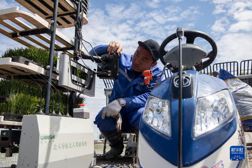 在北大荒集團(tuán)紅衛(wèi)農(nóng)場有限公司智慧農(nóng)業(yè)先行示范區(qū)內(nèi),工作人員設(shè)置無人駕駛插秧機工作路徑(5月11日攝)。據(jù)介紹,無人駕駛智能插秧機應(yīng)用北斗衛(wèi)星定位系統(tǒng),田間作業(yè)時可實現(xiàn)自動避障、掉頭和轉(zhuǎn)彎。新華社記者 張濤 攝