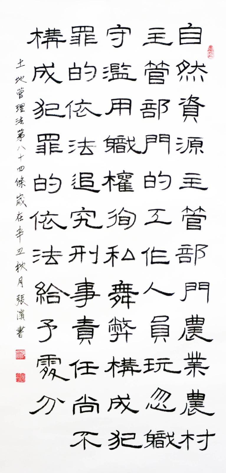 繼1600余位書法家參與書寫《中華人民共和國民法典》全部1260條法條之后,法治日?qǐng)?bào)社聯(lián)合自然資源部法規(guī)司、自然資源部書畫研究會(huì)和北京昌平書法家協(xié)會(huì),將筆端對(duì)準(zhǔn)土地管理“一法一條例”,即《中華人民共和國土地管理法》和《中華人民共和國土地管理法實(shí)施條例》。