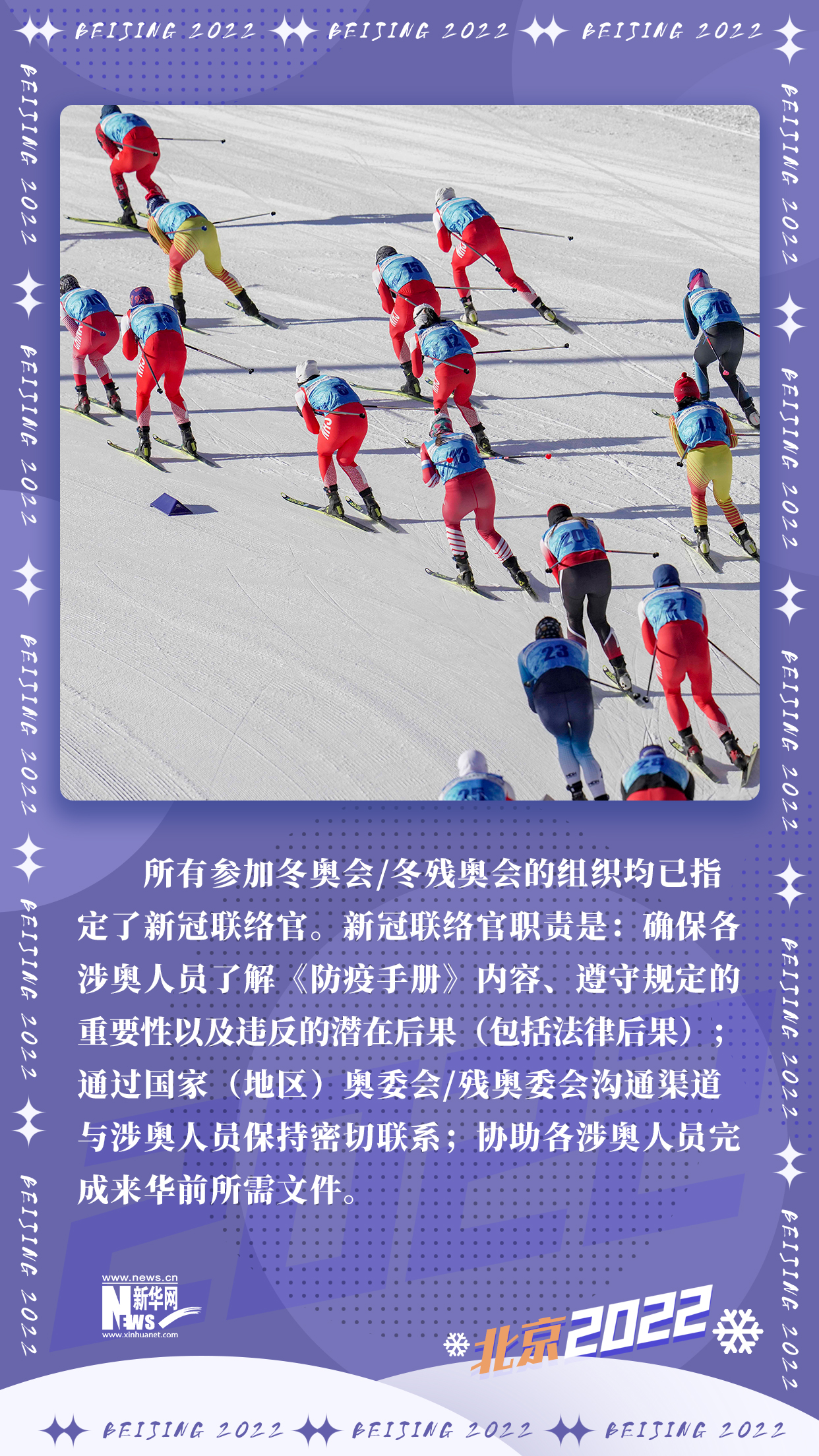 《北京2022年冬奧會和冬殘奧會防疫手冊》第二版日前發(fā)布。與10月發(fā)布的第一版相比,第二版就疫苗接種、海關(guān)入境要求、機(jī)票預(yù)訂、出發(fā)前檢測、冬奧賽時、閉環(huán)管理、住宿、交通、餐飲、核酸檢測、健康監(jiān)測、密接管理以及冬奧會和冬殘奧會轉(zhuǎn)換期等方面,提供了更加細(xì)化的信息。九條關(guān)鍵信息,帶你了解冬奧疫情防控2.0版。