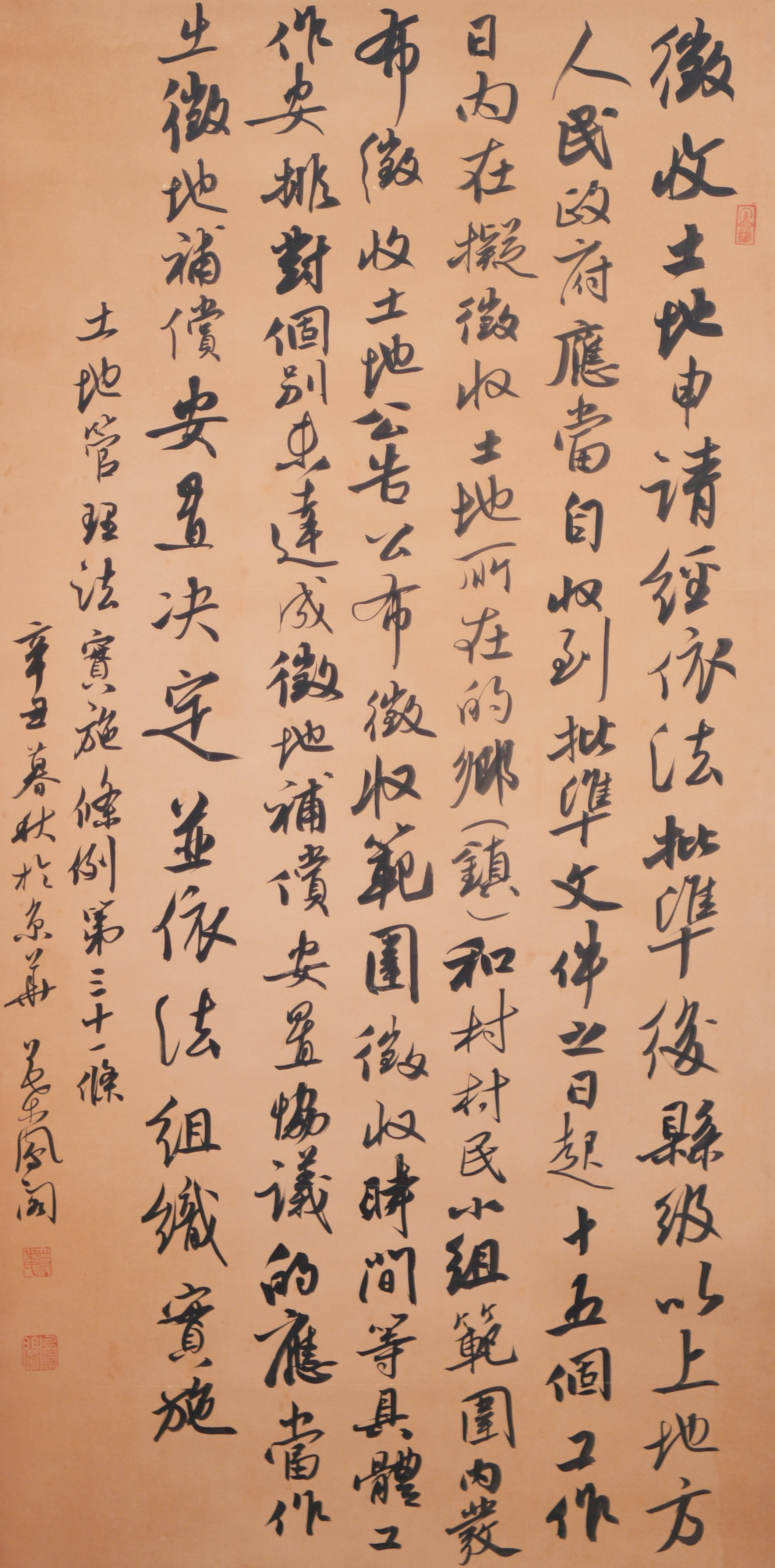 繼1600余位書法家參與書寫《中華人民共和國民法典》全部1260條法條之后,法治日報社聯合自然資源部法規(guī)司、自然資源部書畫研究會和北京昌平書法家協會,將筆端對準土地管理“一法一條例”,即《中華人民共和國土地管理法》和《中華人民共和國土地管理法實施條例》。