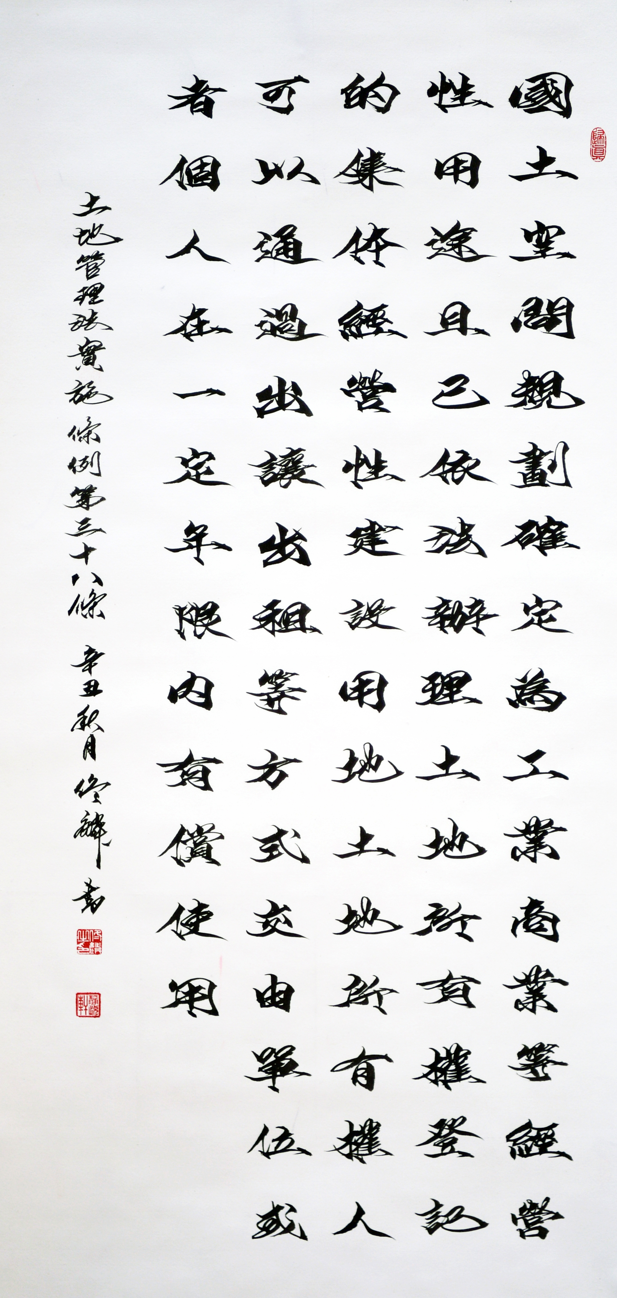 繼1600余位書法家參與書寫《中華人民共和國(guó)民法典》全部1260條法條之后,法治日?qǐng)?bào)社聯(lián)合自然資源部法規(guī)司、自然資源部書畫研究會(huì)和北京昌平書法家協(xié)會(huì),將筆端對(duì)準(zhǔn)土地管理“一法一條例”,即《中華人民共和國(guó)土地管理法》和《中華人民共和國(guó)土地管理法實(shí)施條例》。