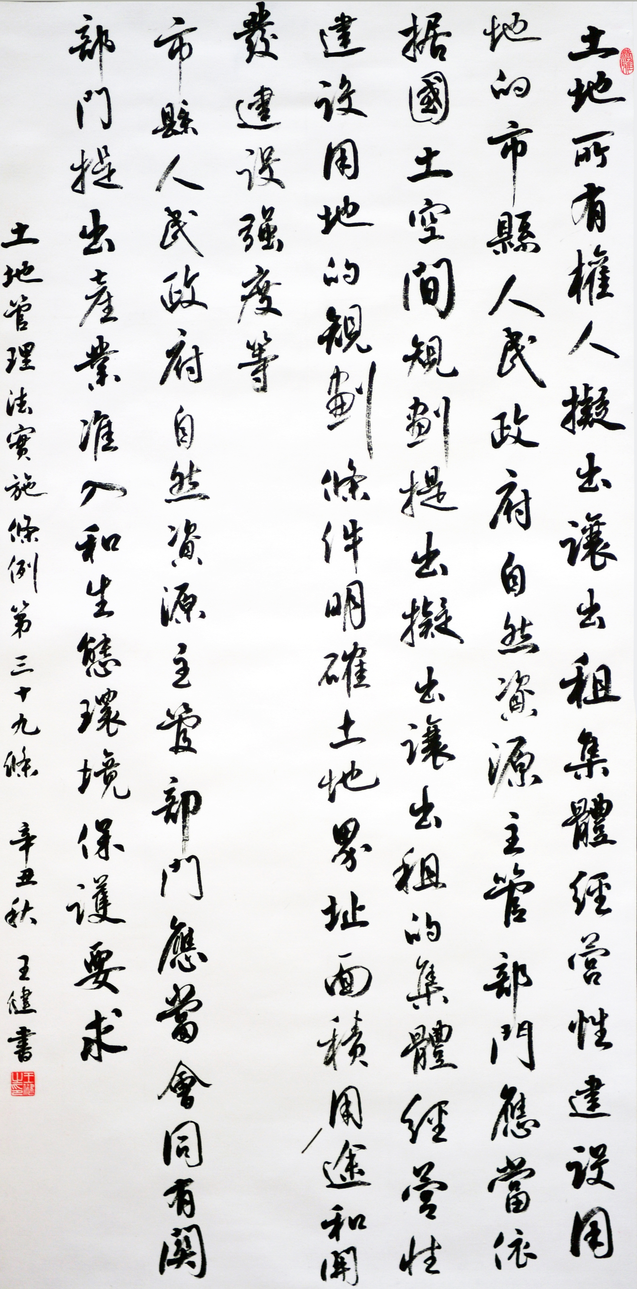 繼1600余位書法家參與書寫《中華人民共和國民法典》全部1260條法條之后,法治日報社聯(lián)合自然資源部法規(guī)司、自然資源部書畫研究會和北京昌平書法家協(xié)會,將筆端對準土地管理“一法一條例”,即《中華人民共和國土地管理法》和《中華人民共和國土地管理法實施條例》。