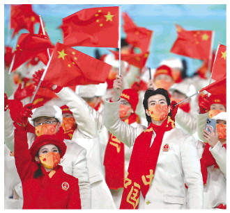 圖為在第二十四屆冬季奧林匹克運動會開幕式上中華人民共和國國旗入場。 新華社記者 蘭紅光 攝