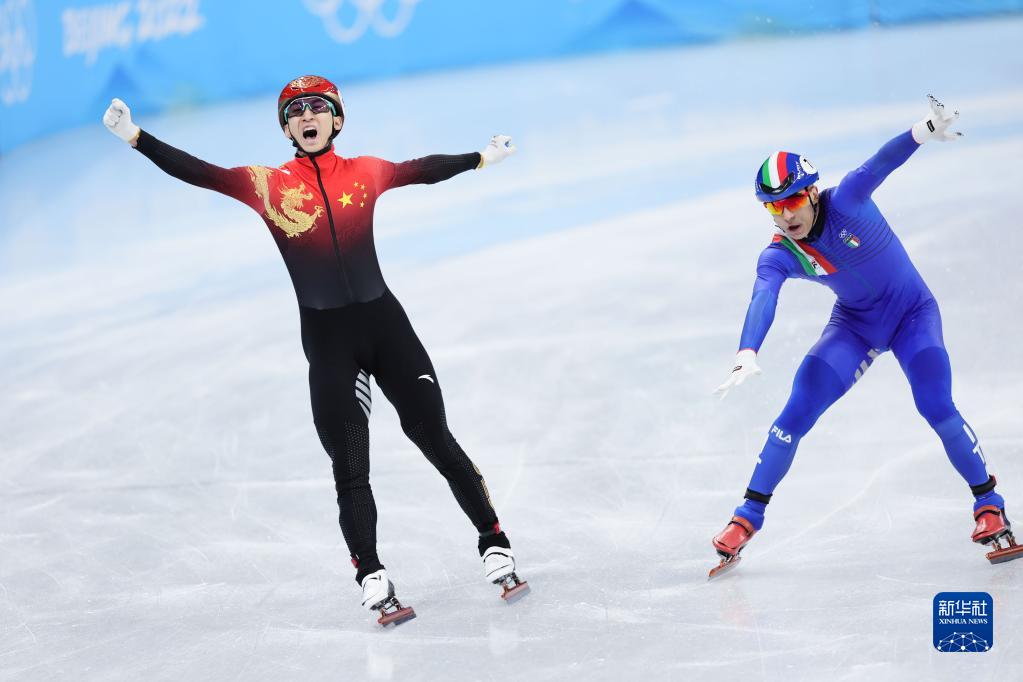 2月5日,中國隊選手武大靖在比賽后慶祝。