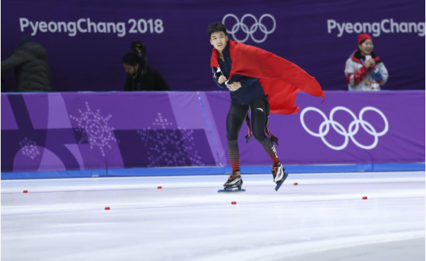 2018年2月19日,中國選手高亭宇在平昌冬奧會速度滑冰男子500米比賽后慶祝,高亭宇以34秒65的成績獲得季軍。新華社記者韓巖攝