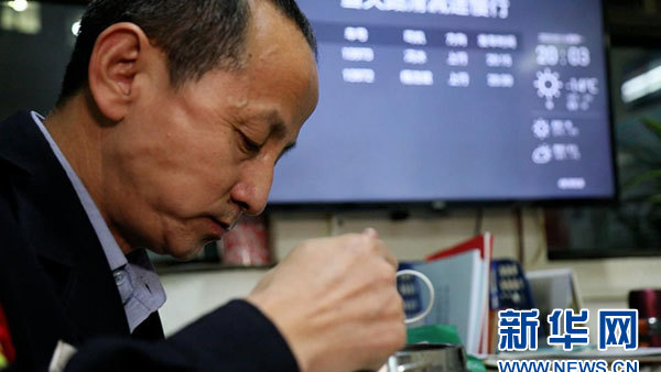 馮冰一邊吃飯,一邊用余光看著調度表上的時間。新華網(wǎng) 吳銀冰 攝