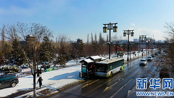 雪天大同公交、大同古城、藍天。新華網(wǎng) 發(fā)(趙文貴 攝)