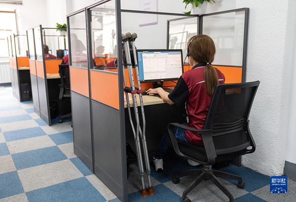 在北京圓通速遞助殘基地暨北京共享客服中心,一名殘疾人員工在工作(2021年5月16日攝)。新華社記者 才揚(yáng) 攝