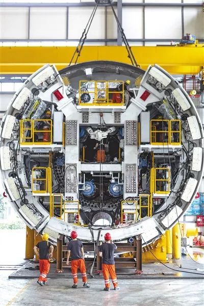 廣東省佛山市順德區(qū),在中鐵華隧聯(lián)合重型裝備有限公司生產(chǎn)車間內(nèi),工人正在組裝盾構(gòu)主機。